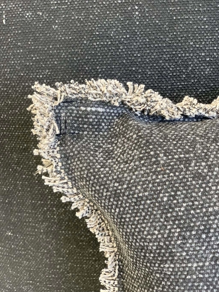 Almohadón cuadrado gris con flecos. Se lo puede combinar con uno más pequeño al tono.