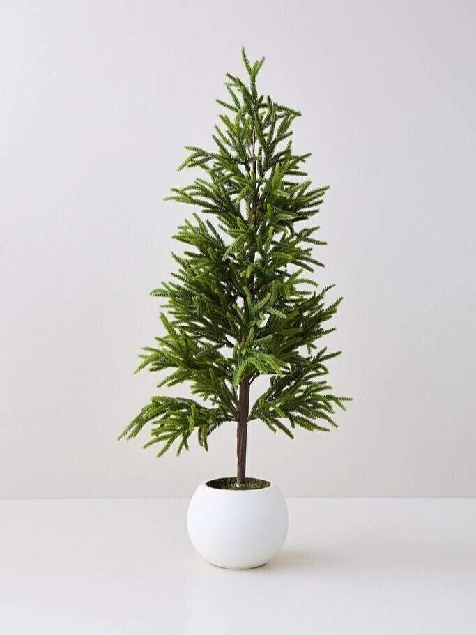 Árbol Pino atrificial de un metro de altura con maceta blanca redonda en la base.