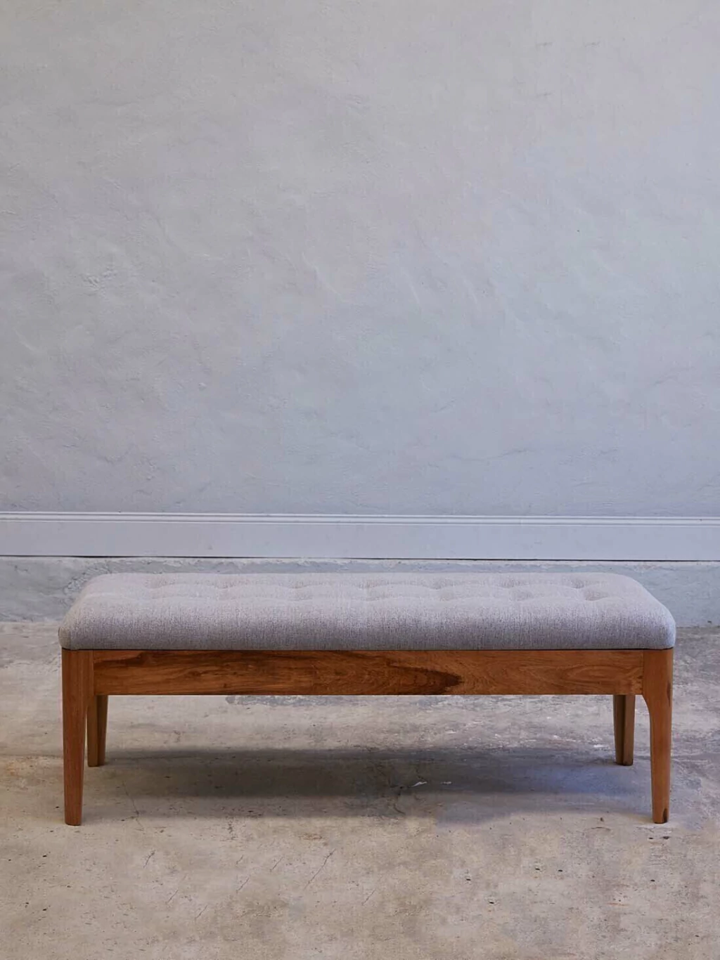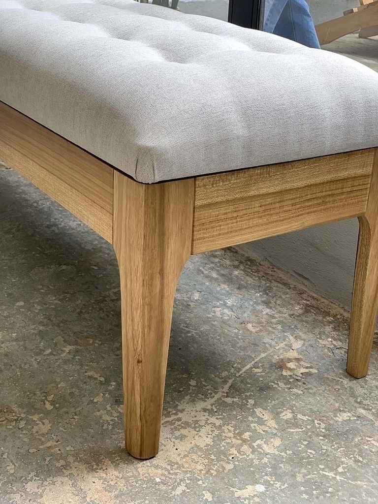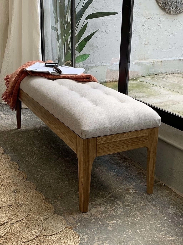 Banqueta de madera de petiribí con tapizado de lino.