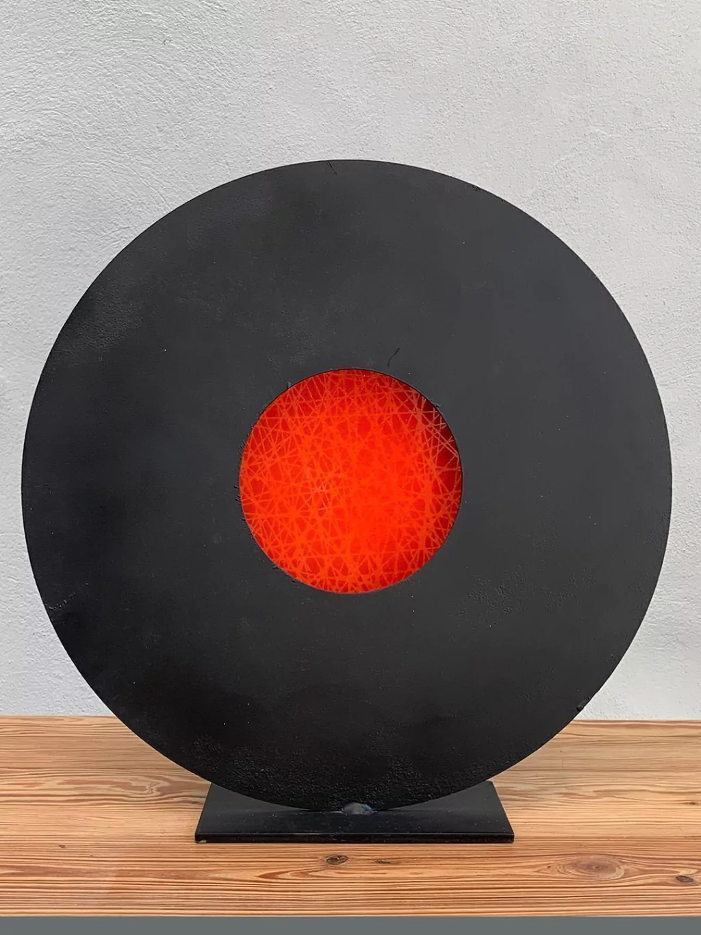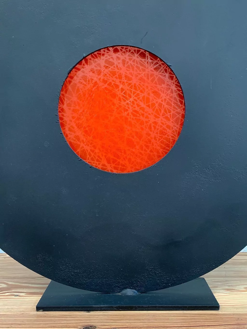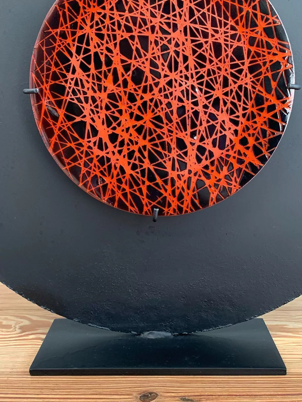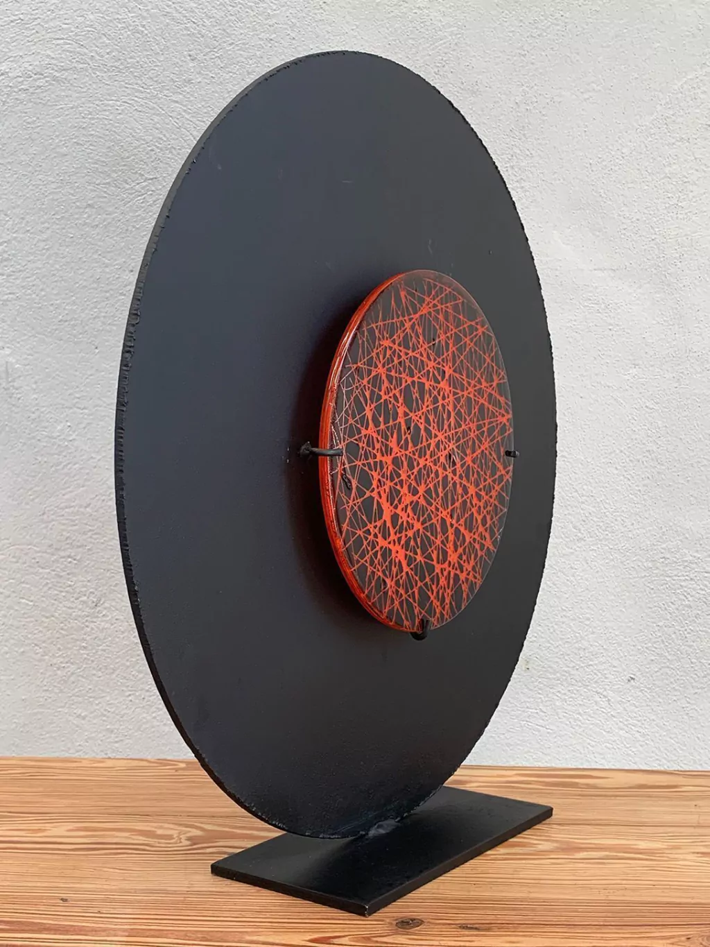 Escultura con estructura de hierro y plato de vidrio pintado realizado por la artista Ale Koch.