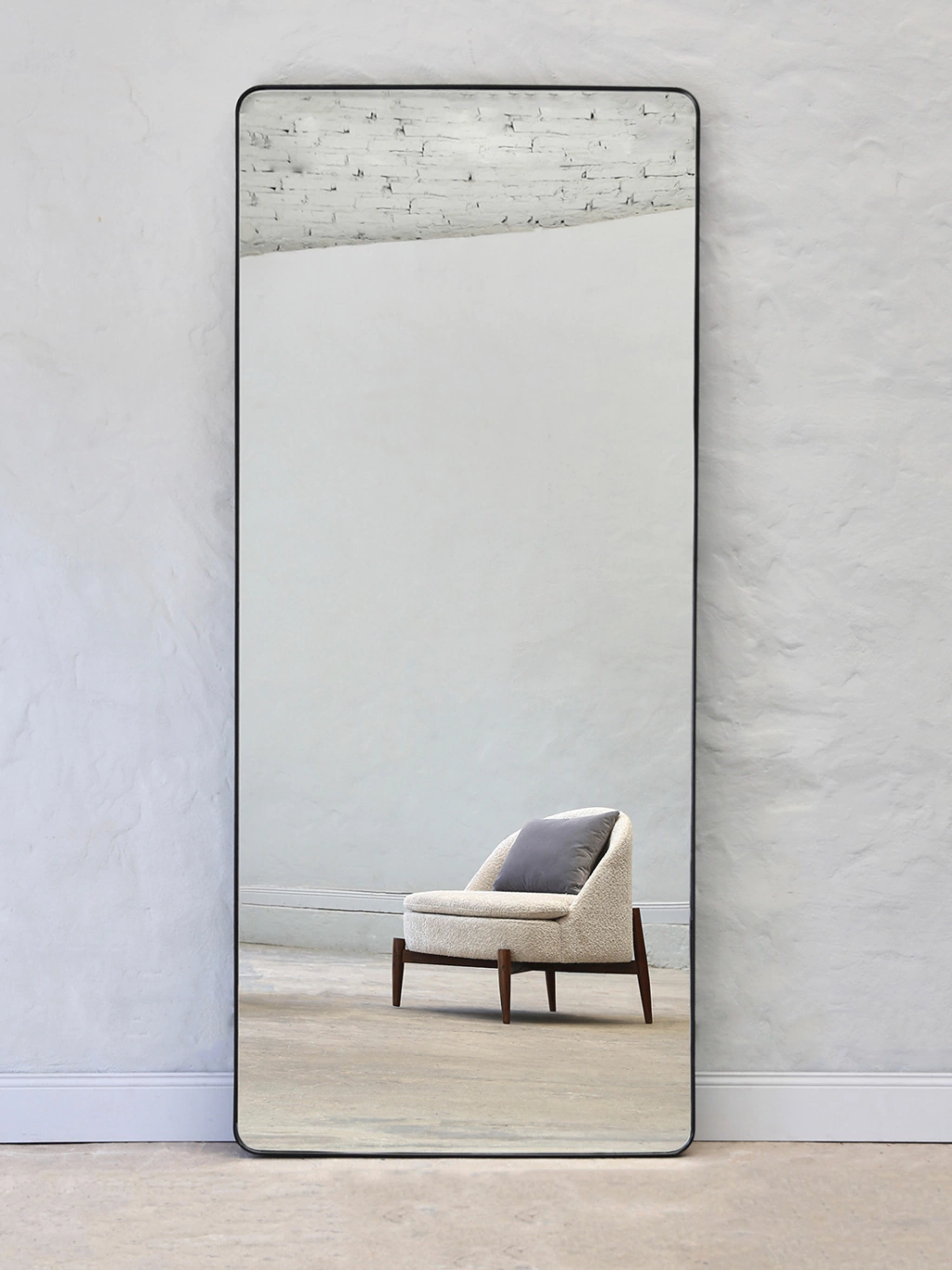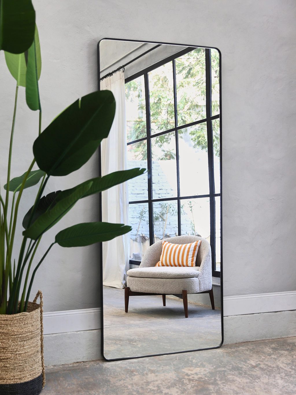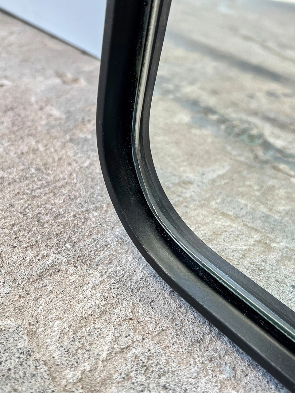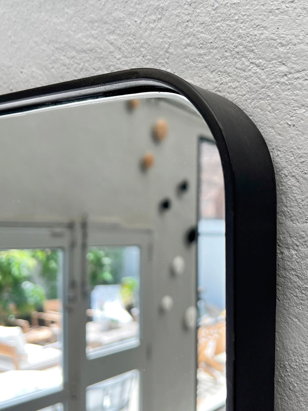 Espejo de hierro pintado al horno color negro semi mate con puntas redondeadas. El marco es planchuela de hierro 38mm x 5 mm de espesor. Viene con ganchos atras para colocarlo horizontal o vertical.