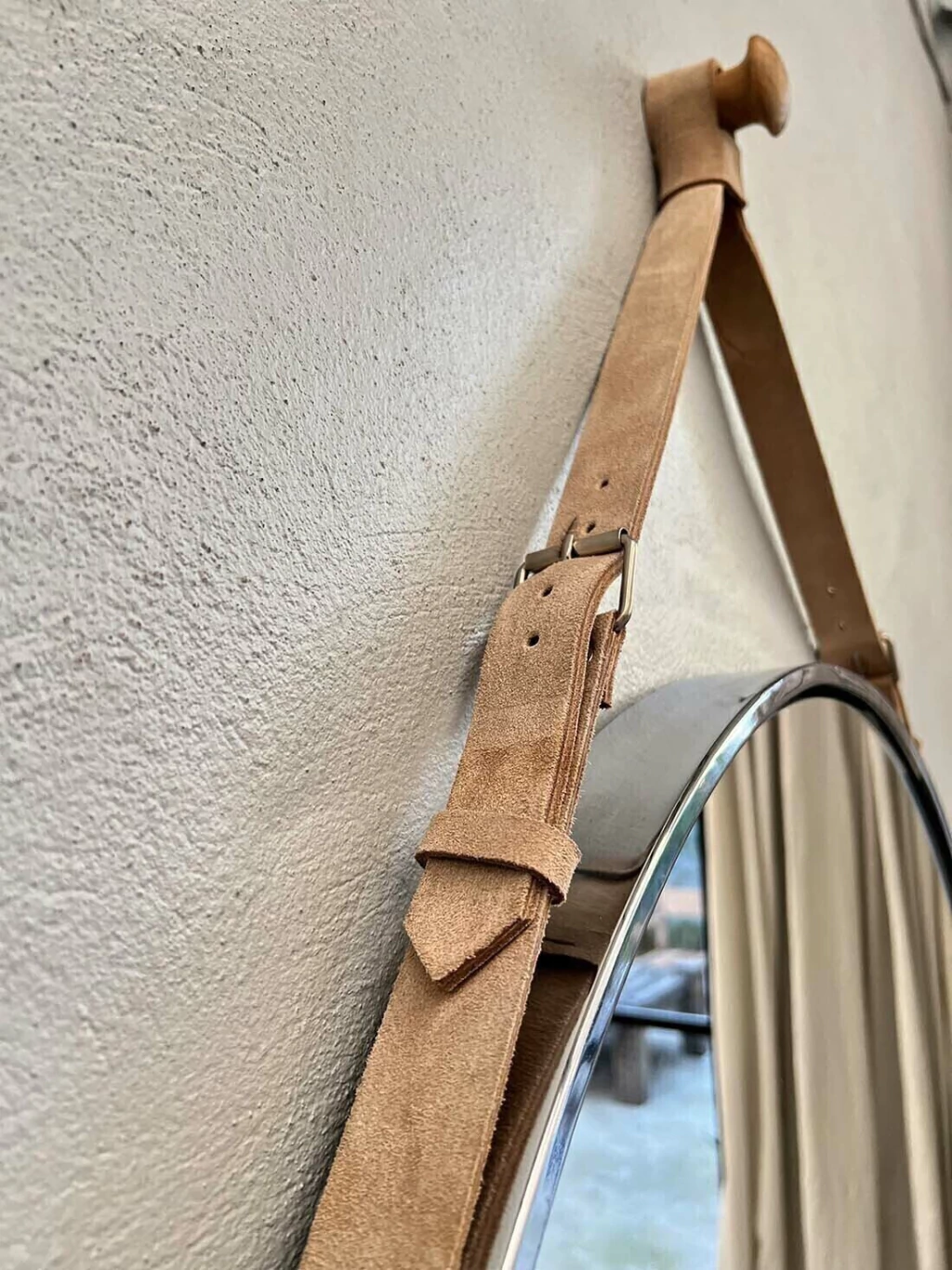 Es un espejo que generalmente queda muy bien en una entrada o pallier de una casa porque el color cromado del marco le da modernidad y la tira de cuero le da calidez al ambiente. Tambien queda genial en un baño o toilette arriba de la bacha.