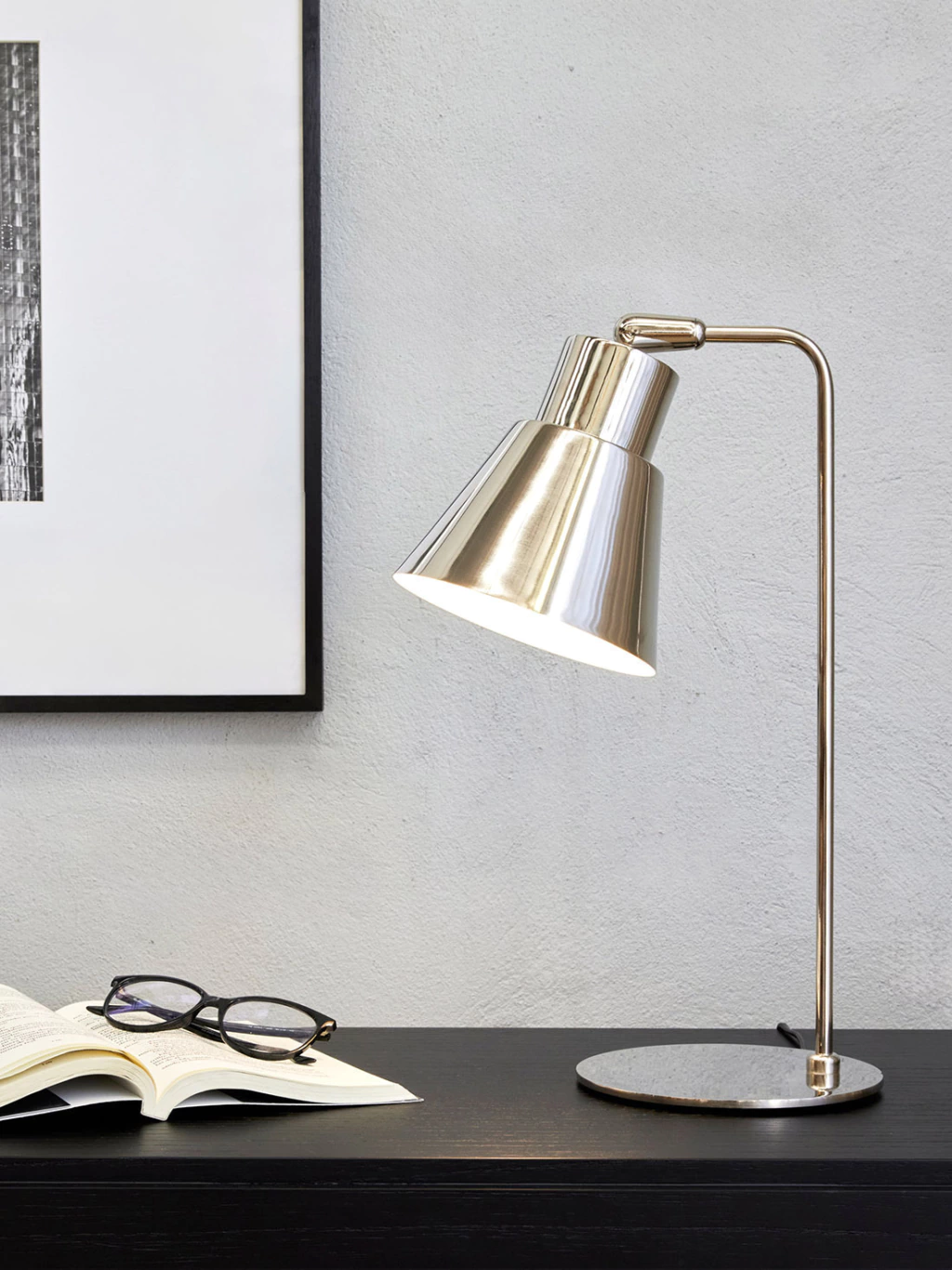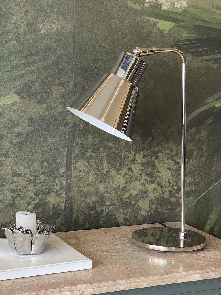 Lámpara de mesa plateada. También viene la opción negra.