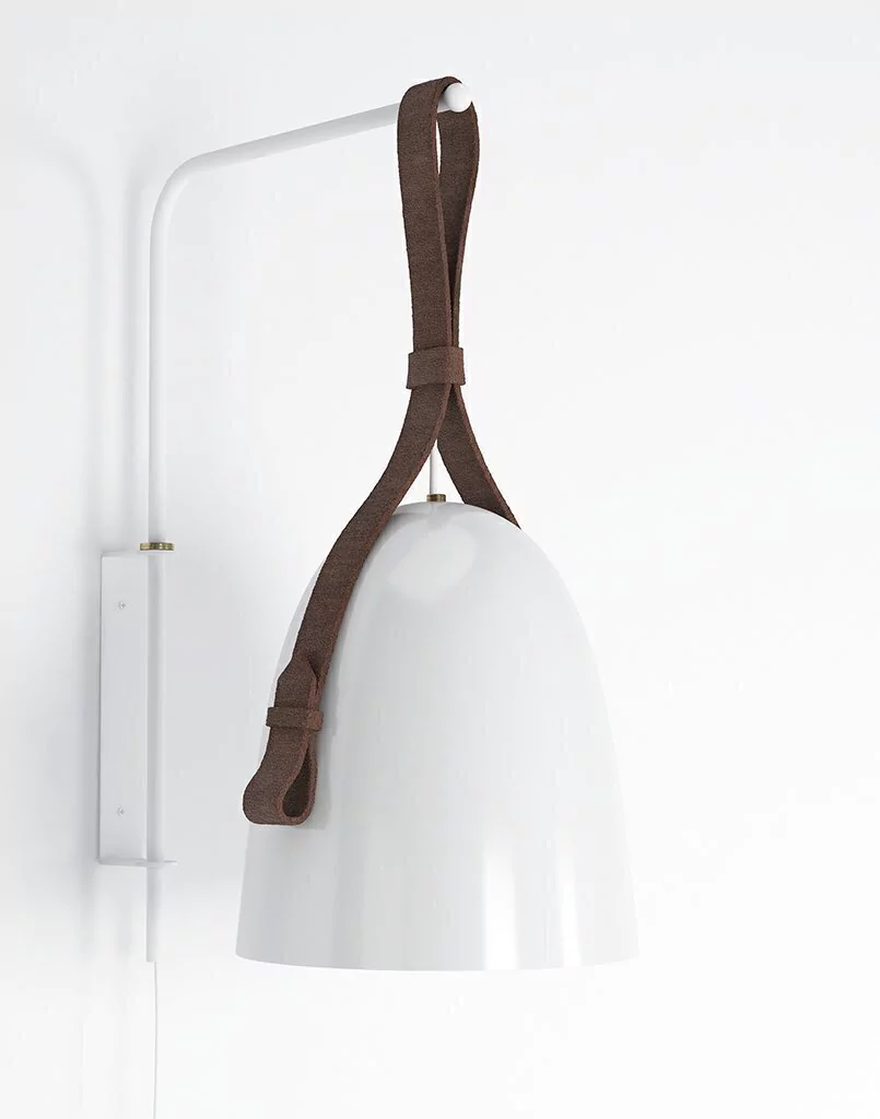 Lámpara con soporte para pared, pantalla y tira de cuero. También viene la opción negra.