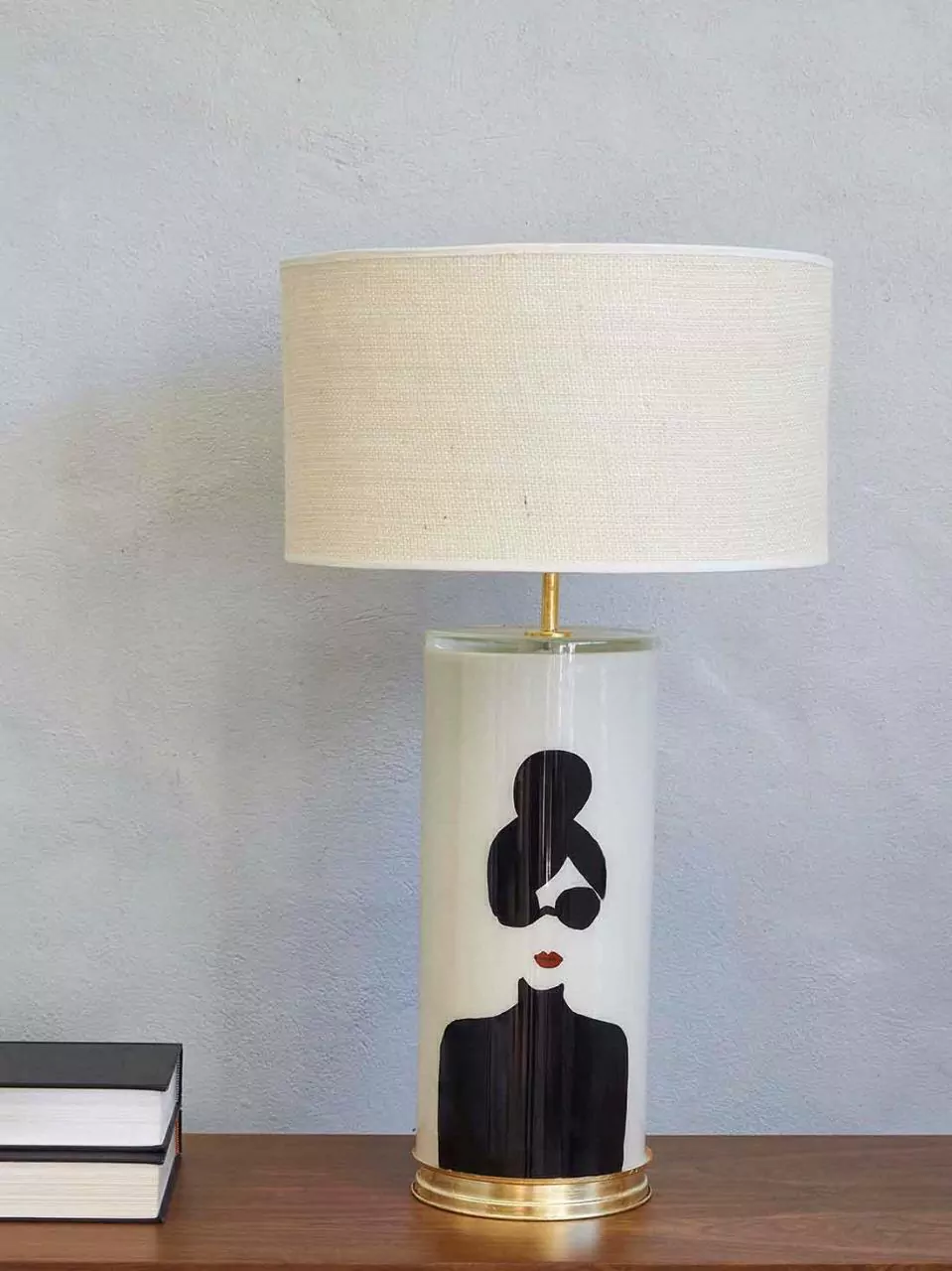 Lámpara de vidrio pintada a mano con rayas dorada, visón y con terminaciones en dorado a la hoja. Pantalla de lino rústica. También viene un tamaño más chico.