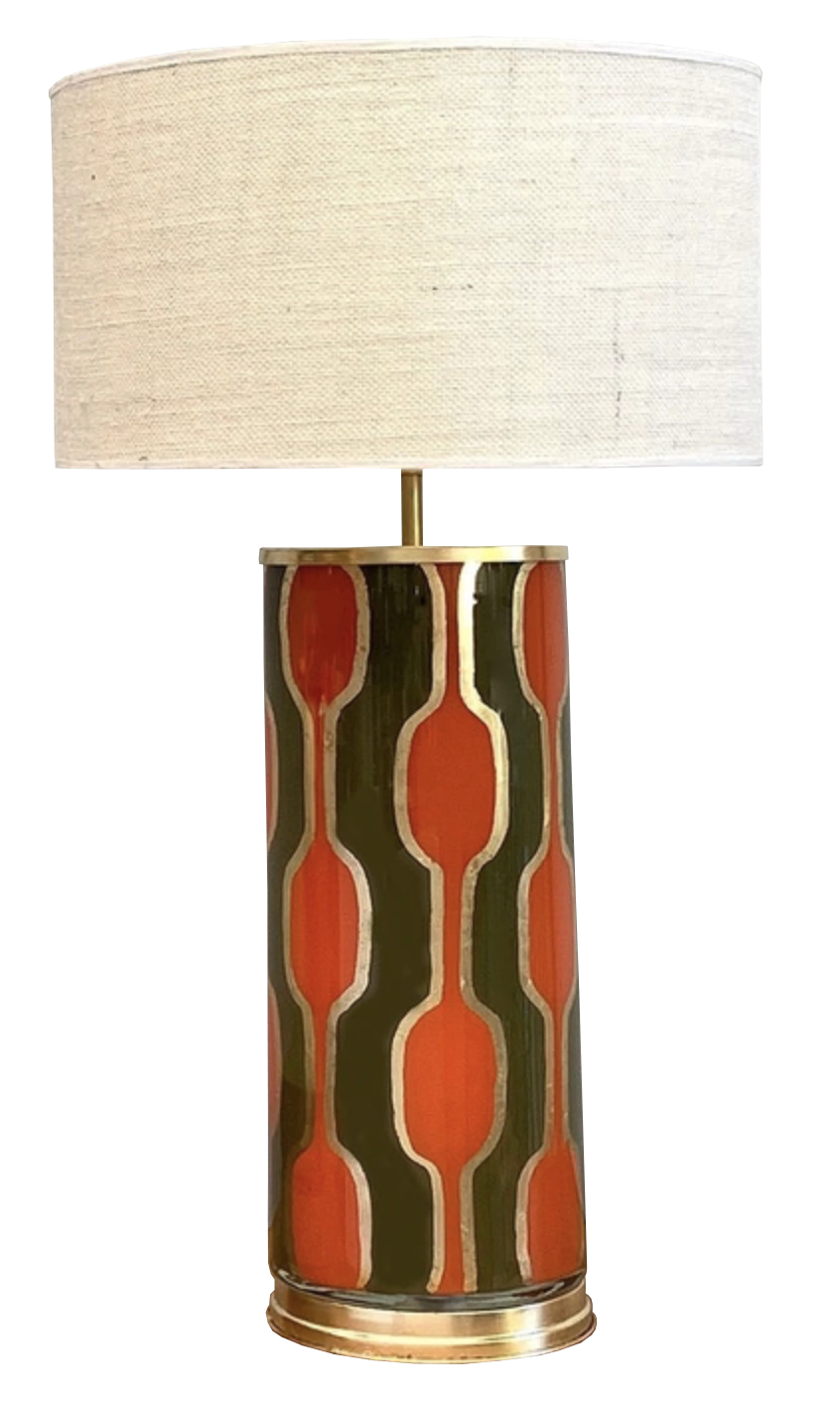 Lámpara de vidrio pintada a mano color naranja y verde, con terminaciones en dorado a la hoja y pantalla de lino.
