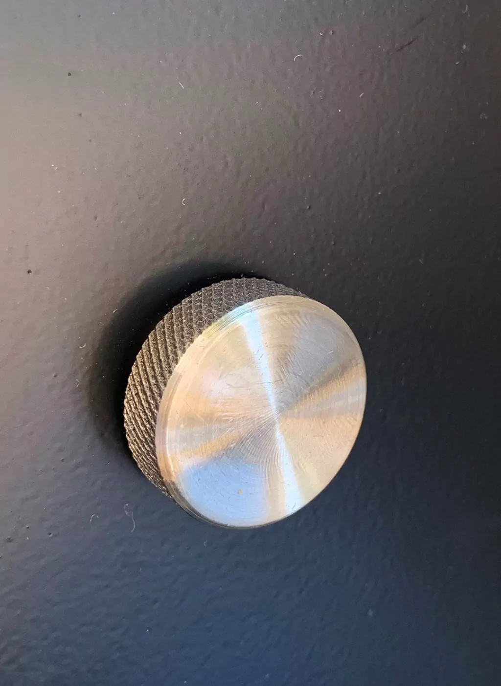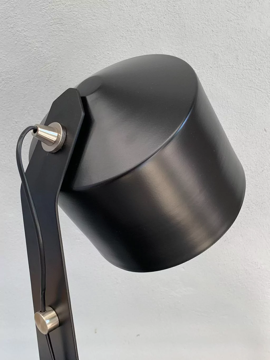 Lámpara con estructura y pantalla de aluminio negro con botones plateados.