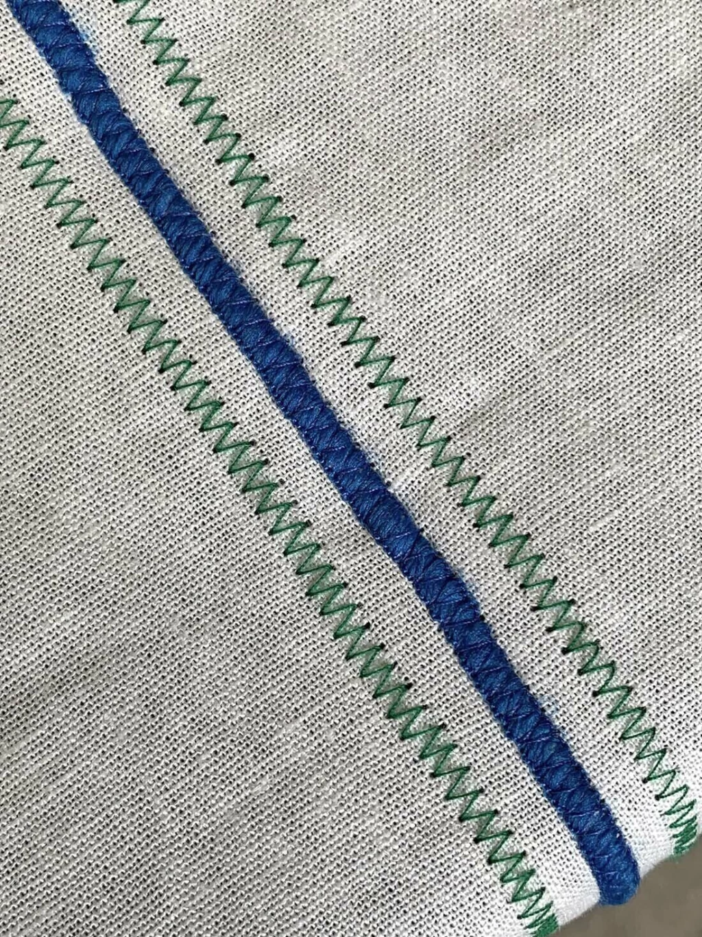 Mantel rectangular de Lino Magiko color off white con bordes en color azul francia y costura zig zag en color verde.