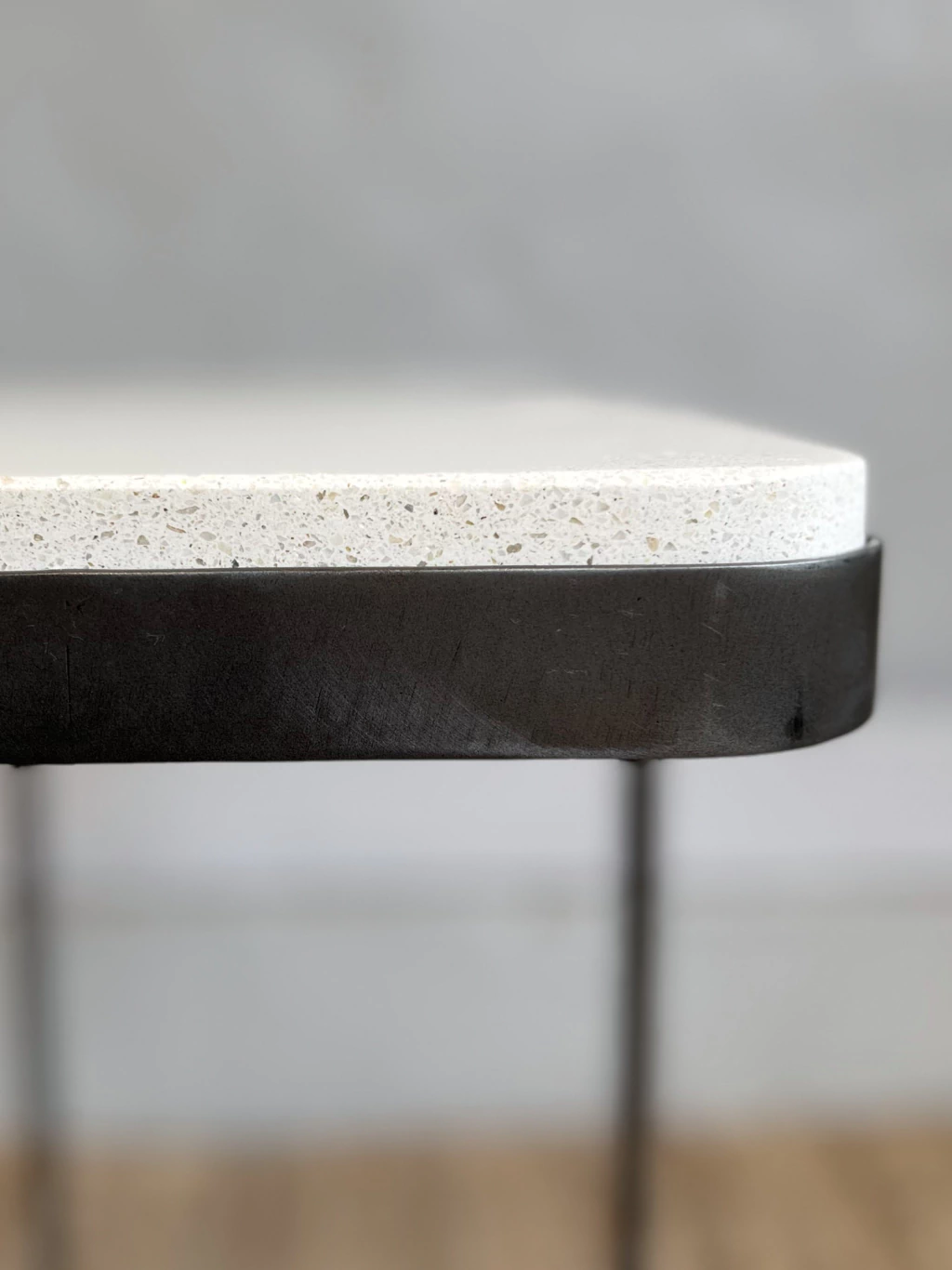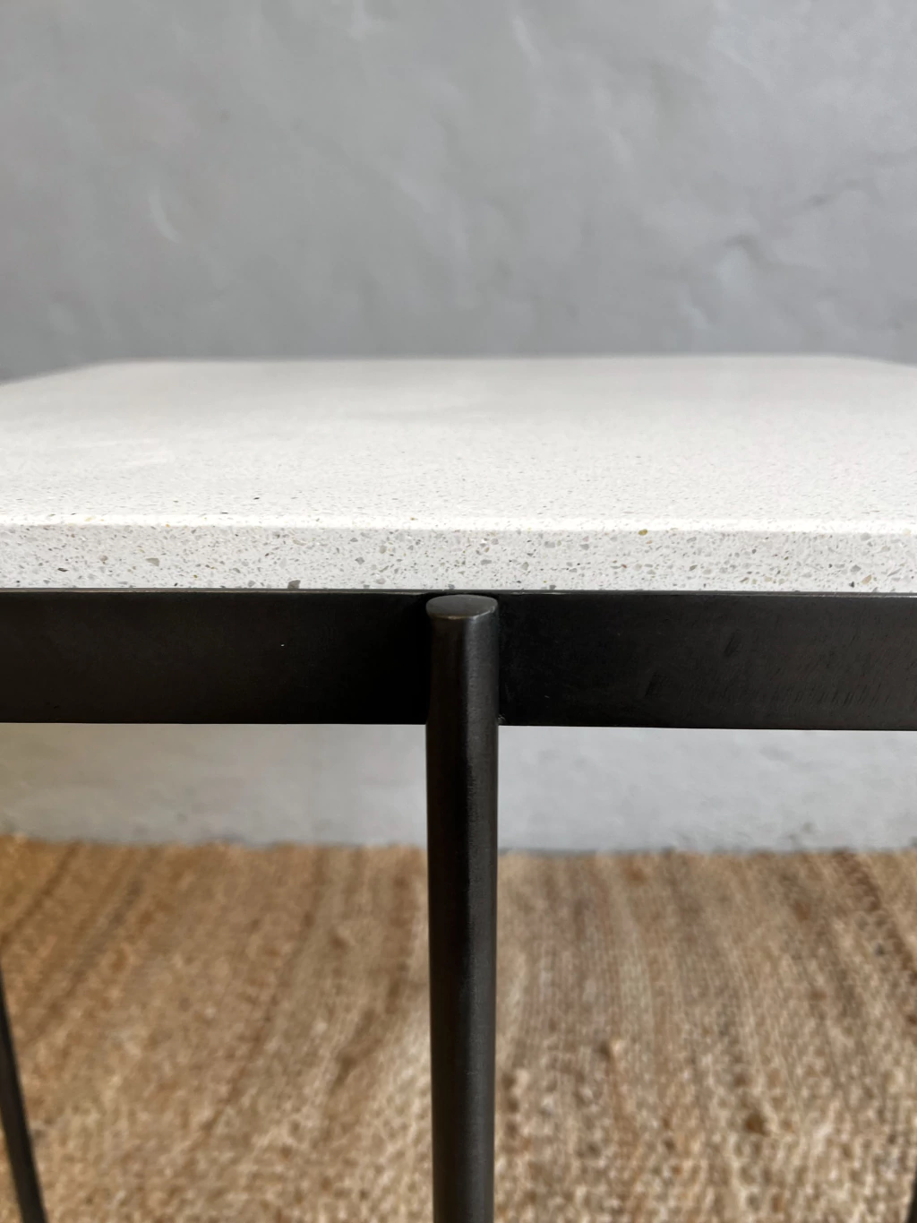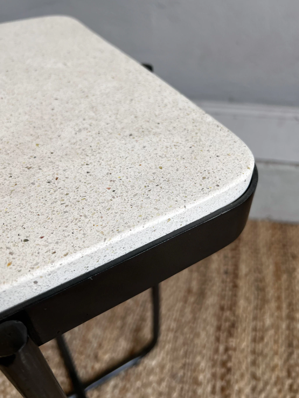 Mesa auxiliar rectangular con bordes curvos en hierro gris con tapa de terrazo.