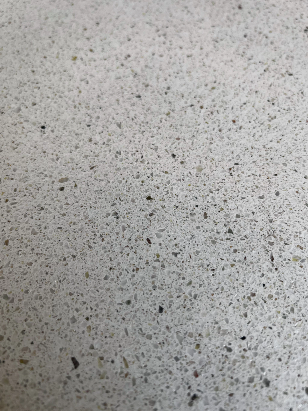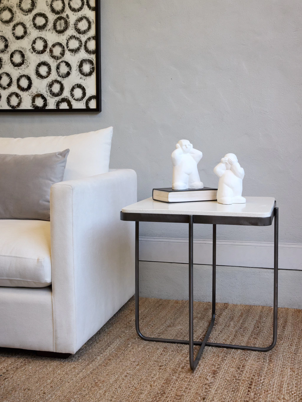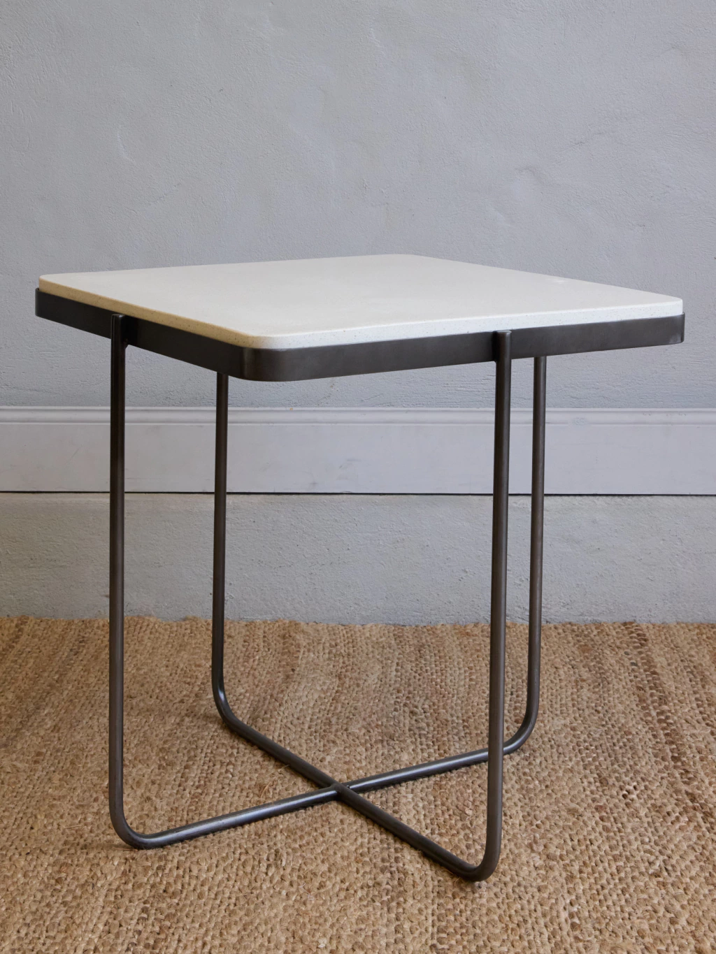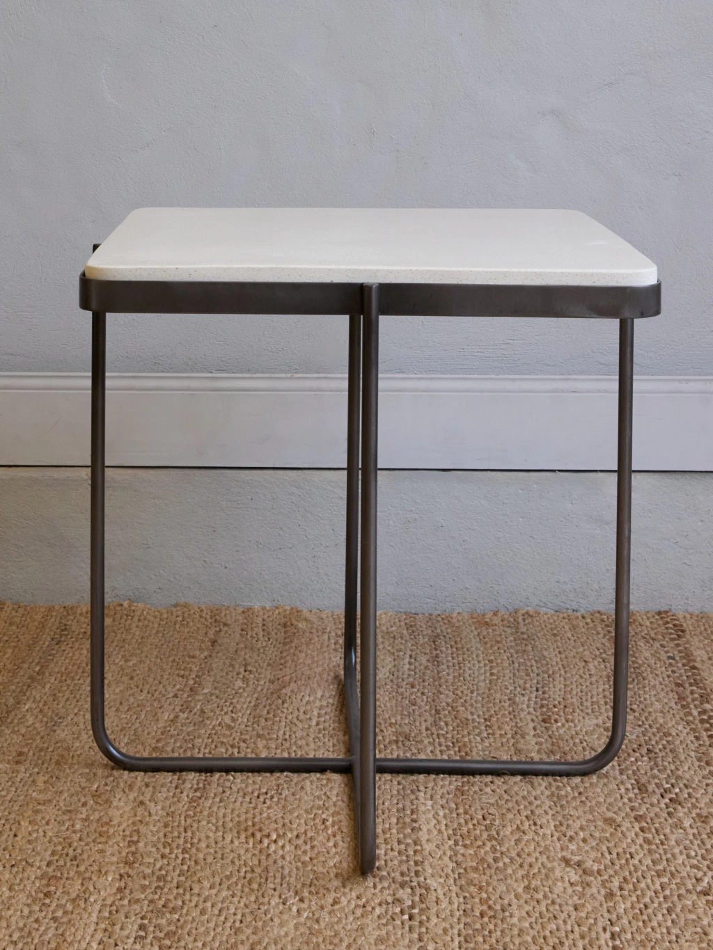 Mesa auxiliar rectangular con bordes curvos en hierro gris con tapa de terrazo.