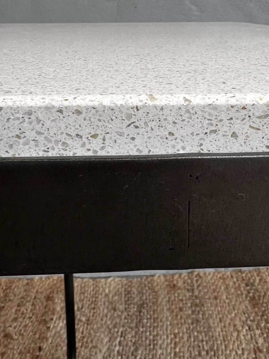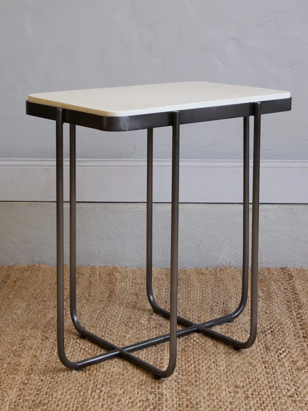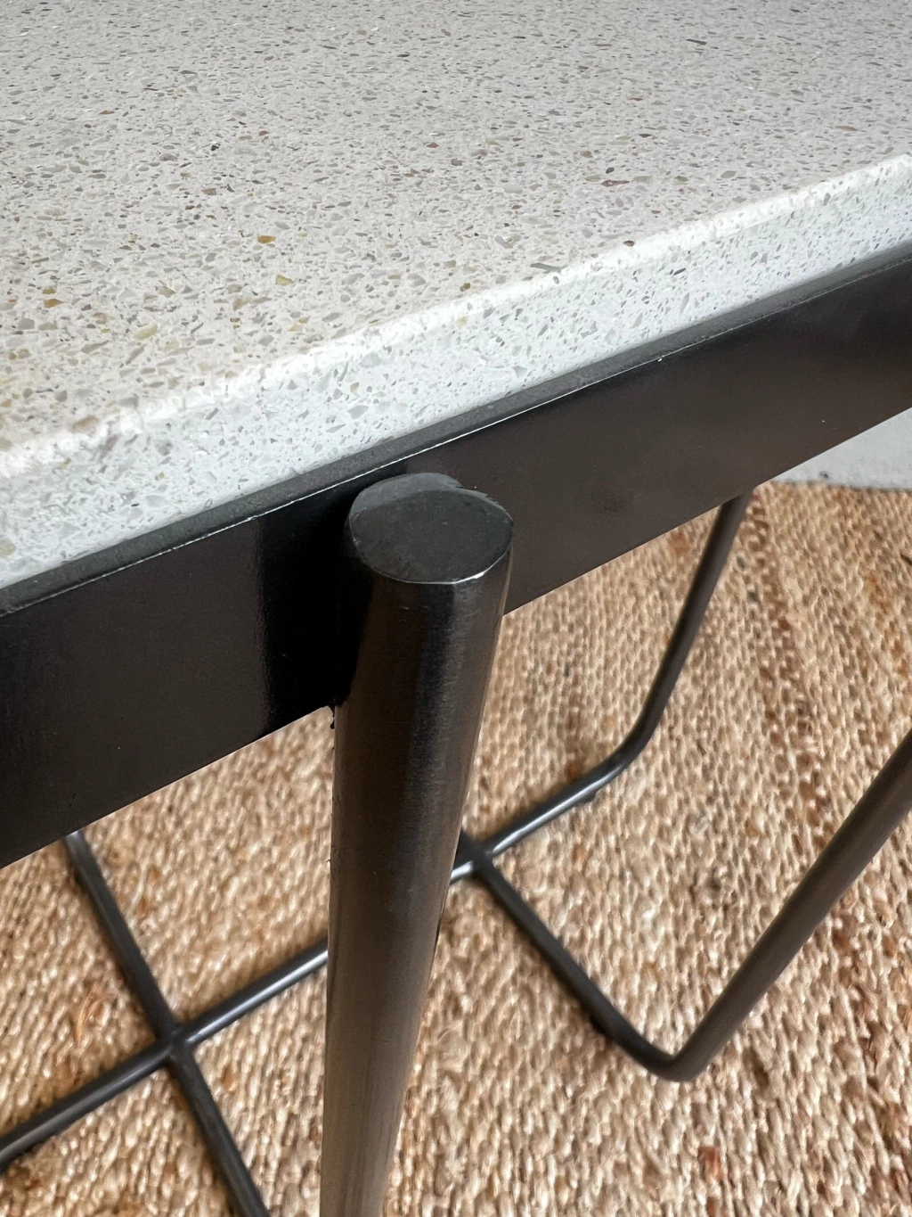 Mesa auxiliar rectangular con bordes curvos en hierro gris con tapa de terrazo.