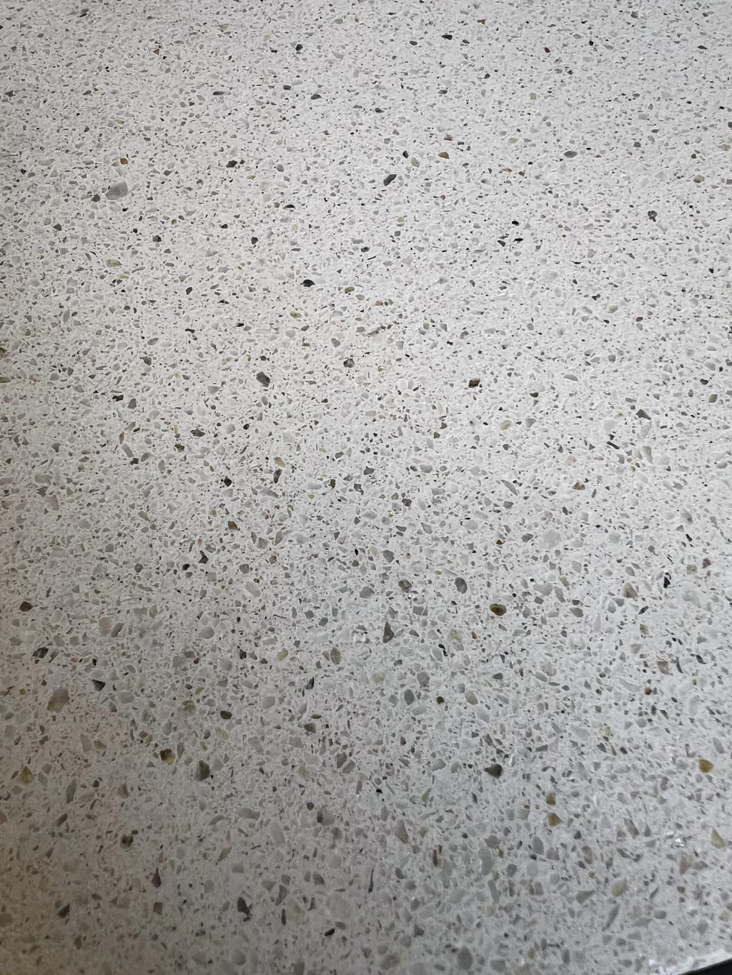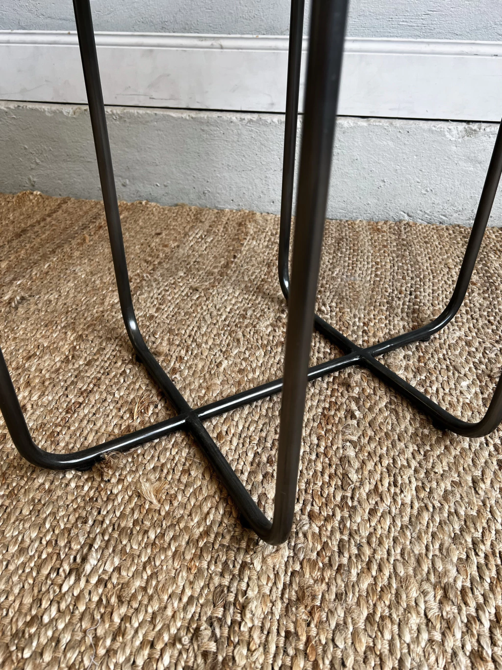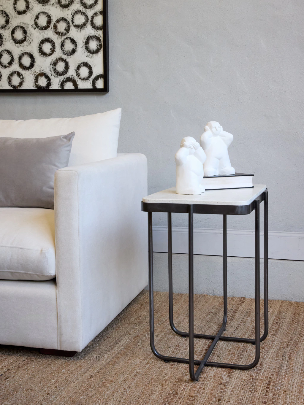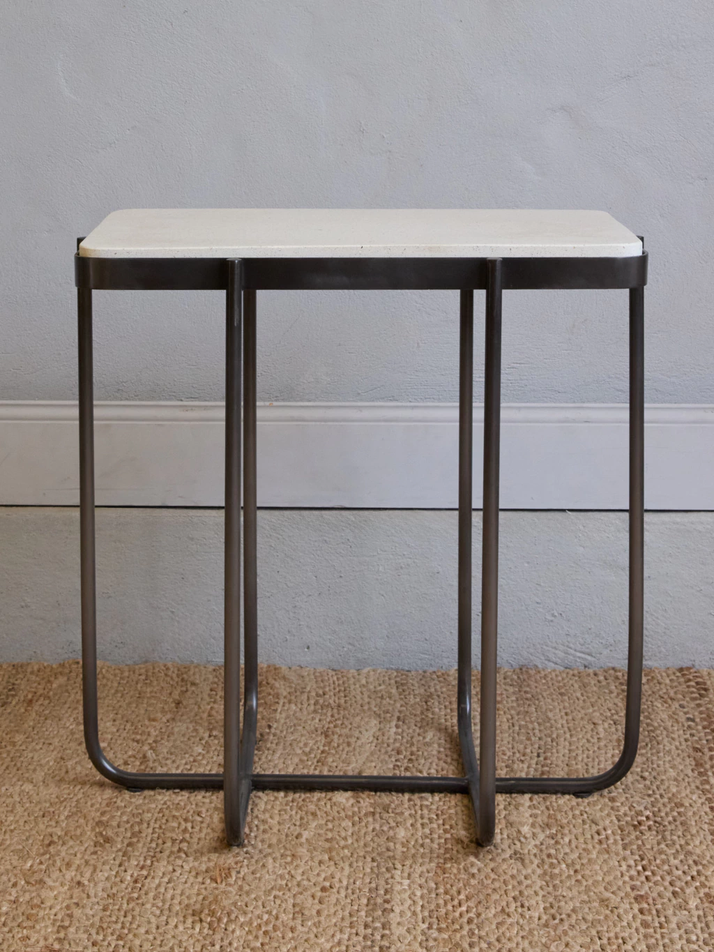 Mesa auxiliar rectangular con bordes curvos en hierro gris con tapa de terrazo.