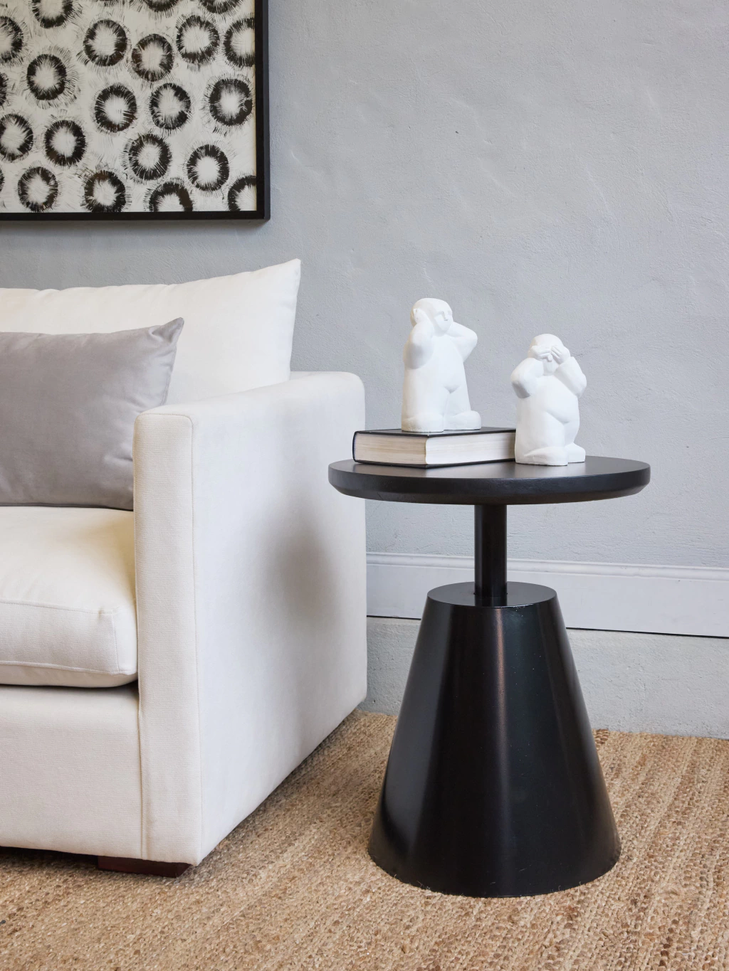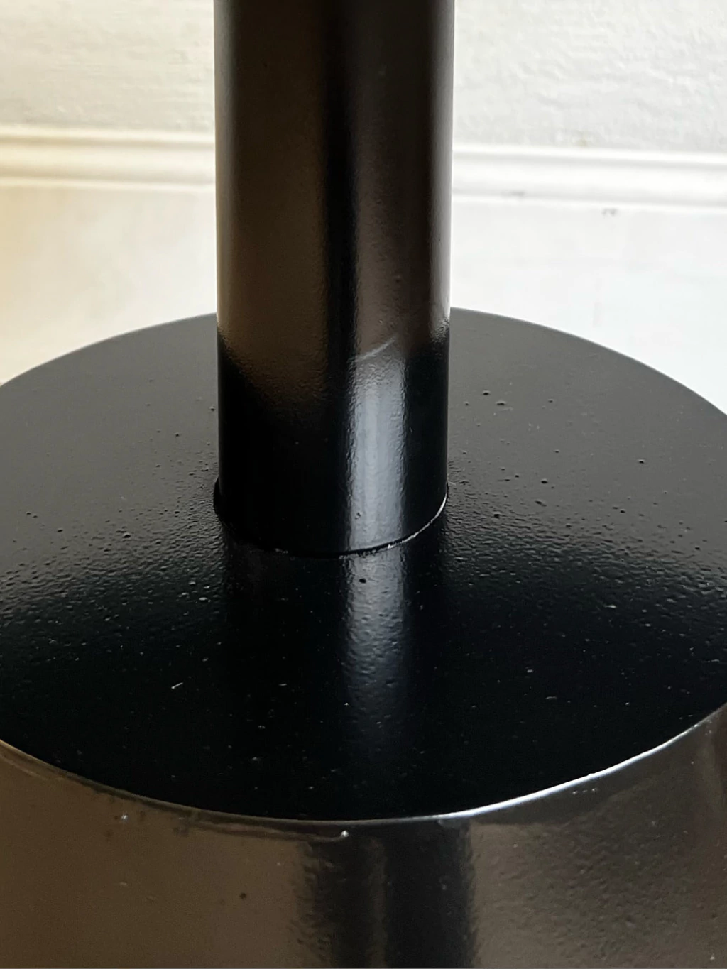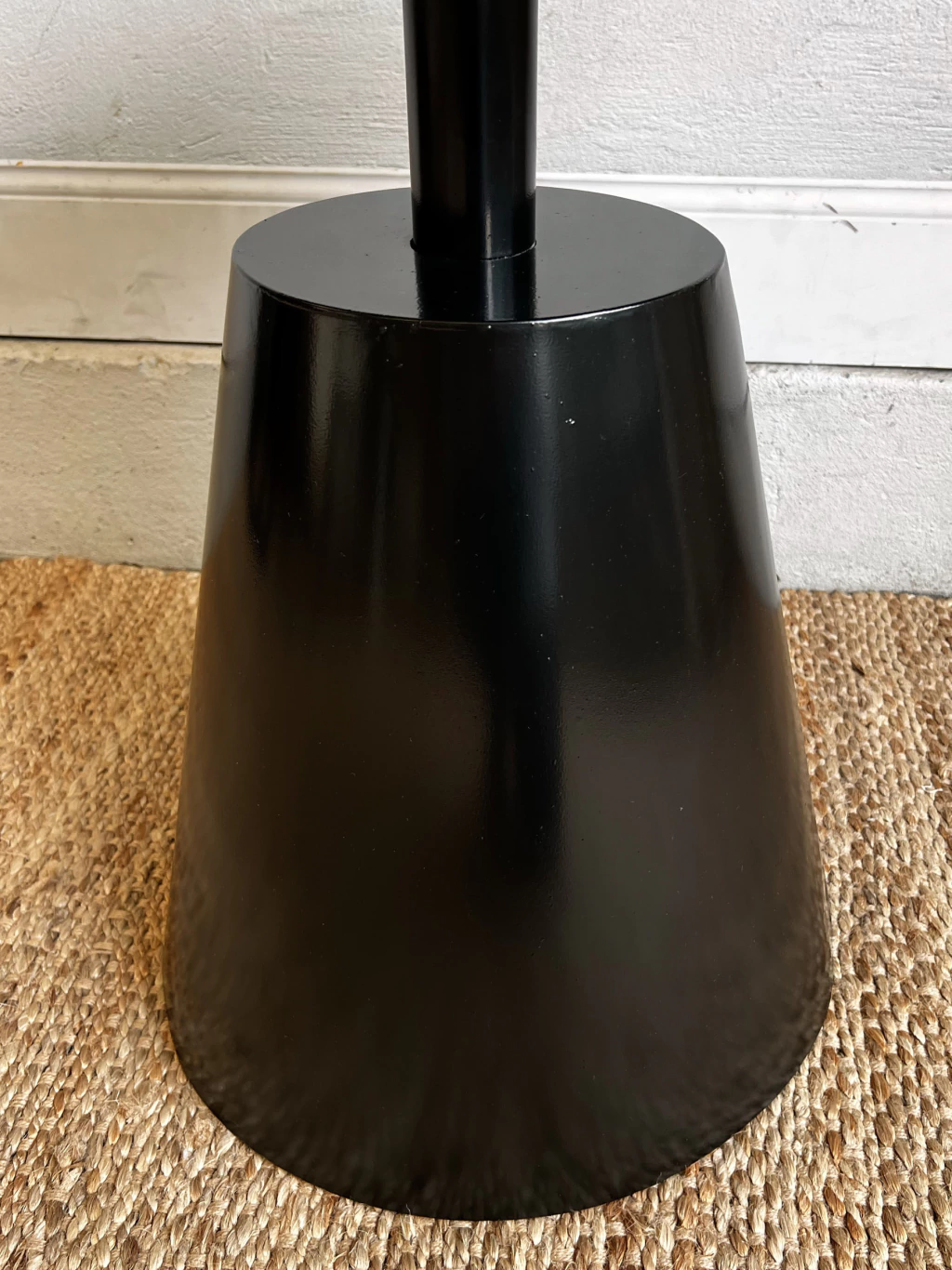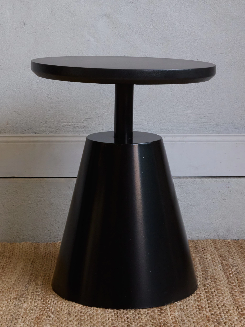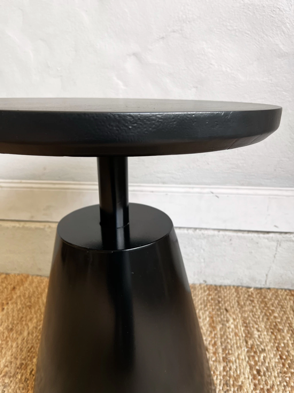 Mesa auxiliar redonda en hierro negro con tapa de madera.