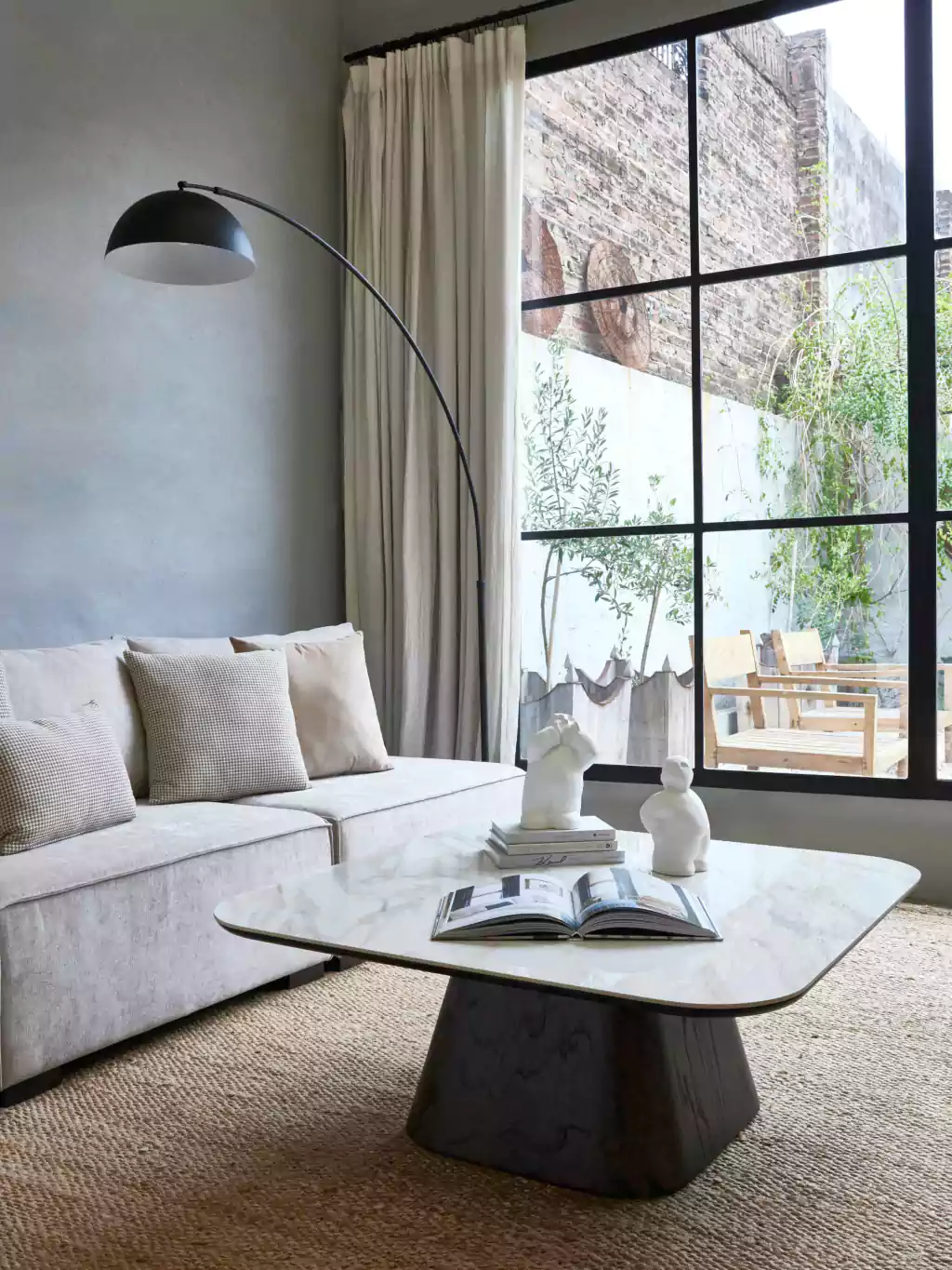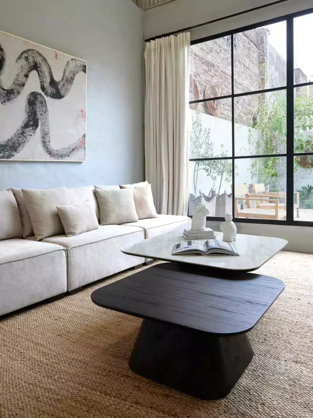 Mesa baja de madera paraíso con lustre y tapa de marmolstone.