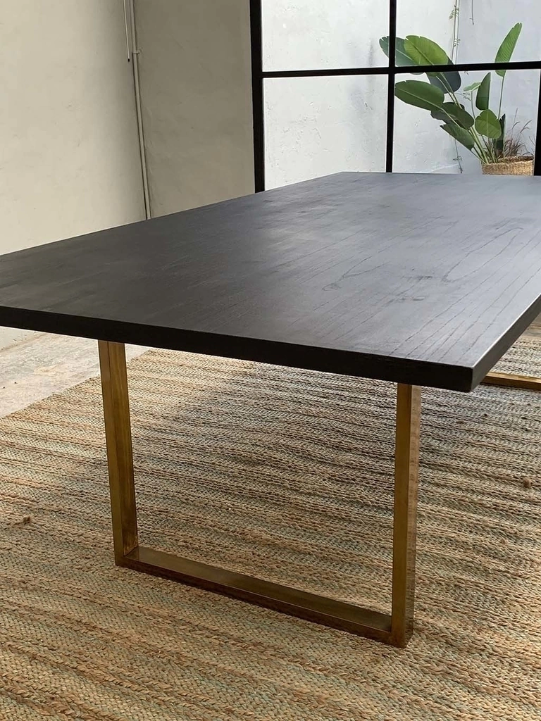 Mesa comedor con base de hierro dorado y madera enchapada paraíso con poro abierto en color negro.