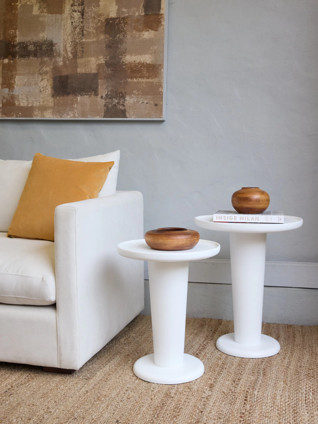 Mesa auxiliar redonda de madera paraiso poro abierto.