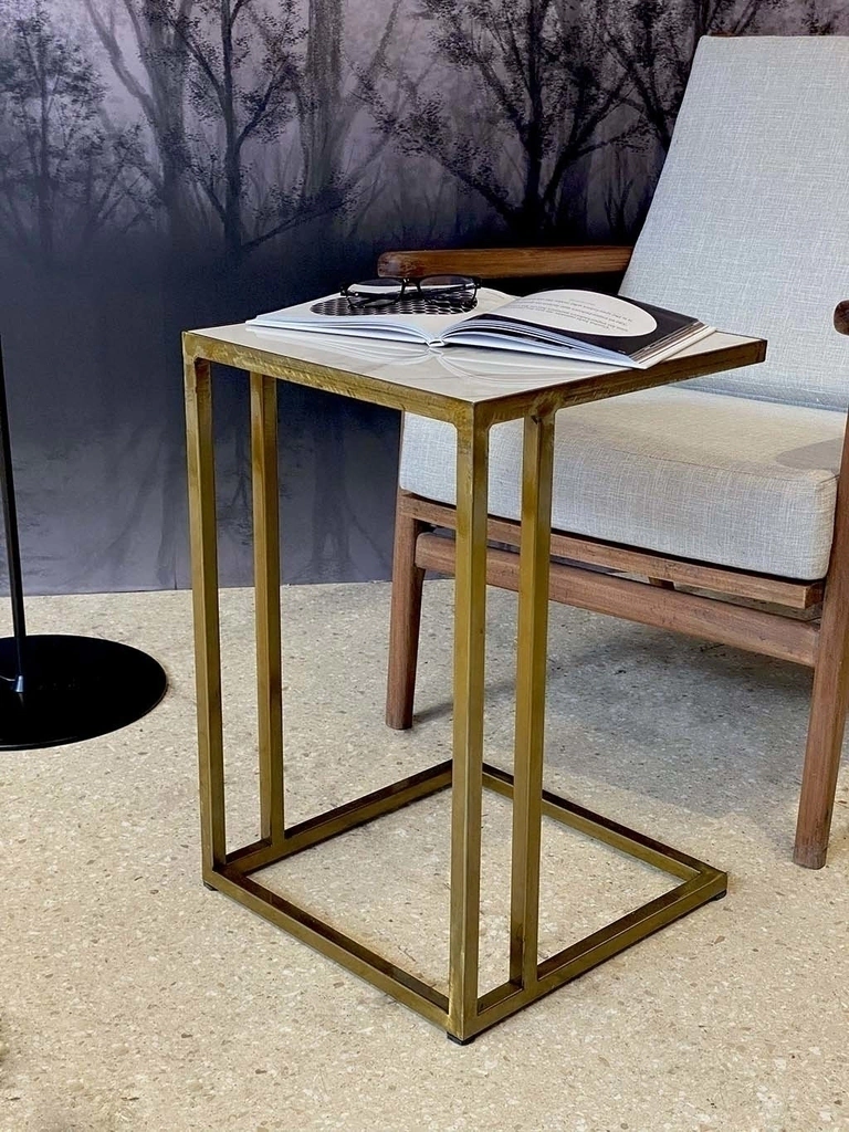 Mesa con estructura de hierro y tapa de porcelanato blanco.