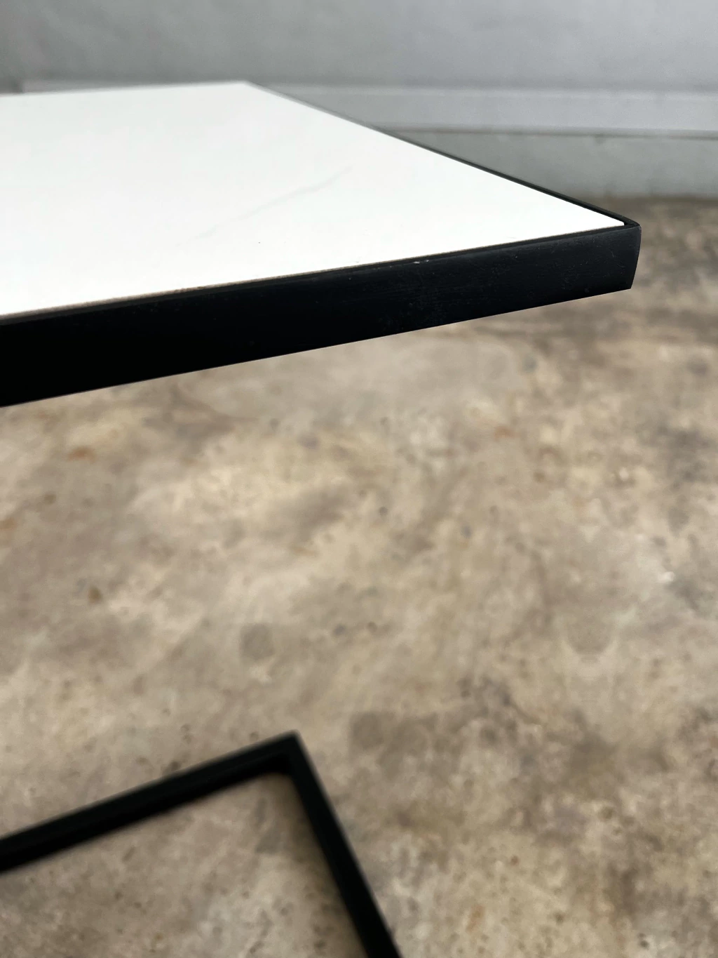 Mesa con estructura de hierro y tapa de porcelanato blanco.