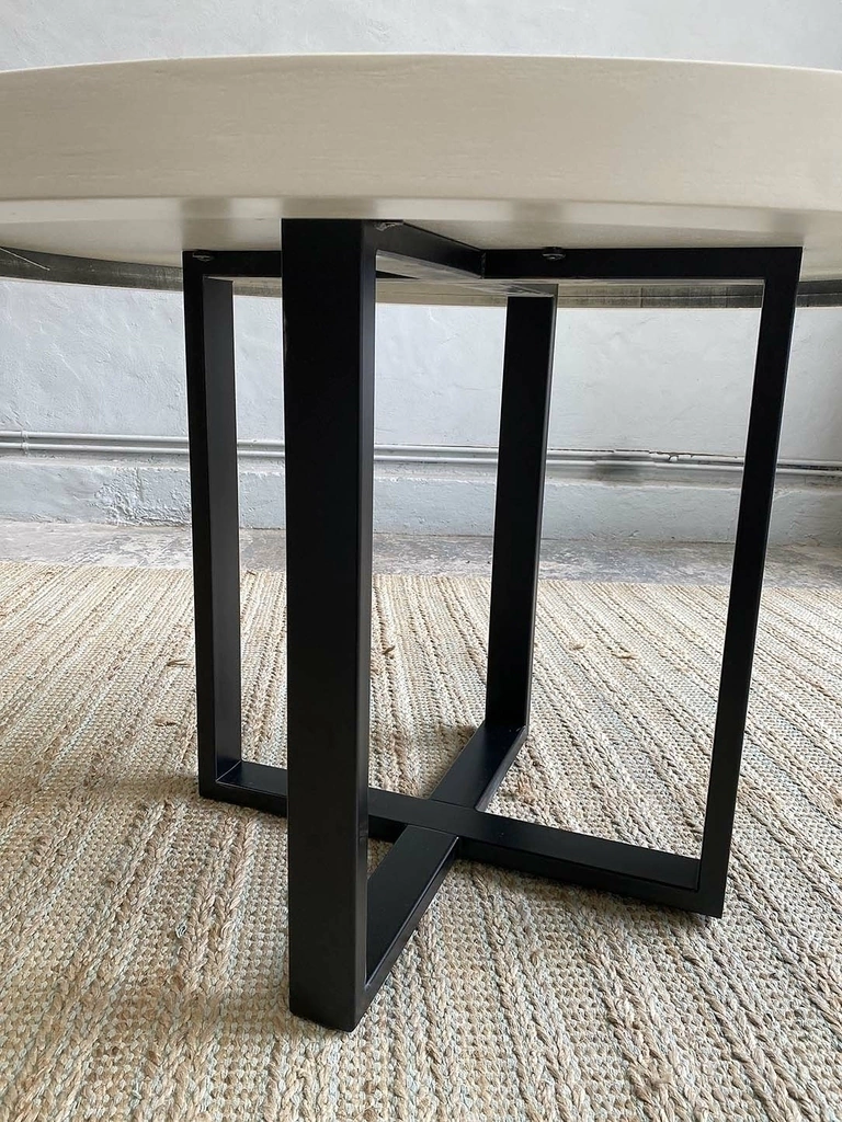 Mesa de comedor de madera paraíso patinada en blanco con base de hierro laqueado en negro.