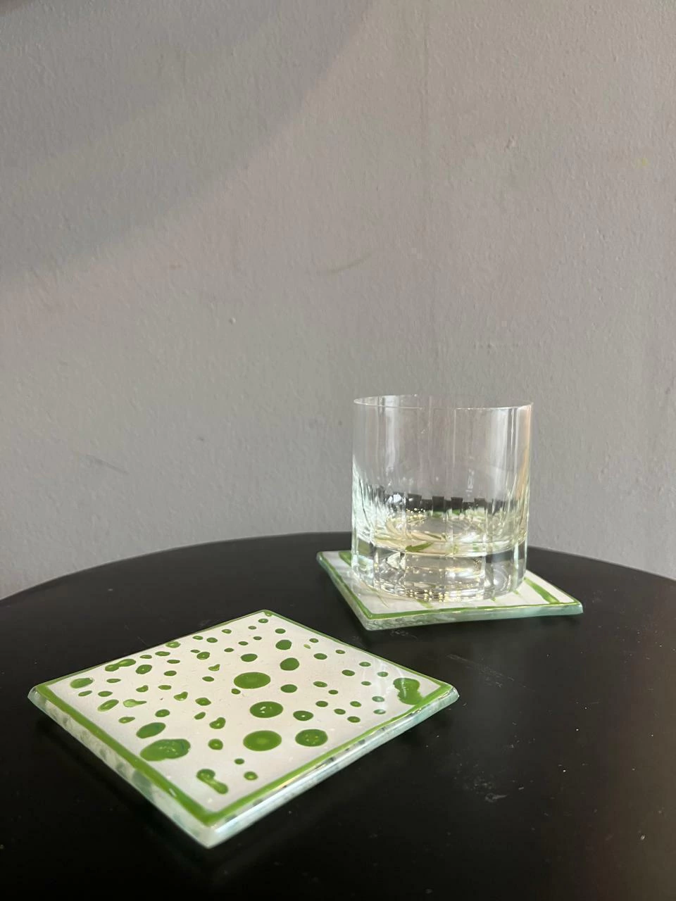 Posavasos de vidrio termoformado con motivo a cuadros. Viene con revés antideslizante. Hay variantes de los cuados negros, verdes o grises y un motivo de cruces.