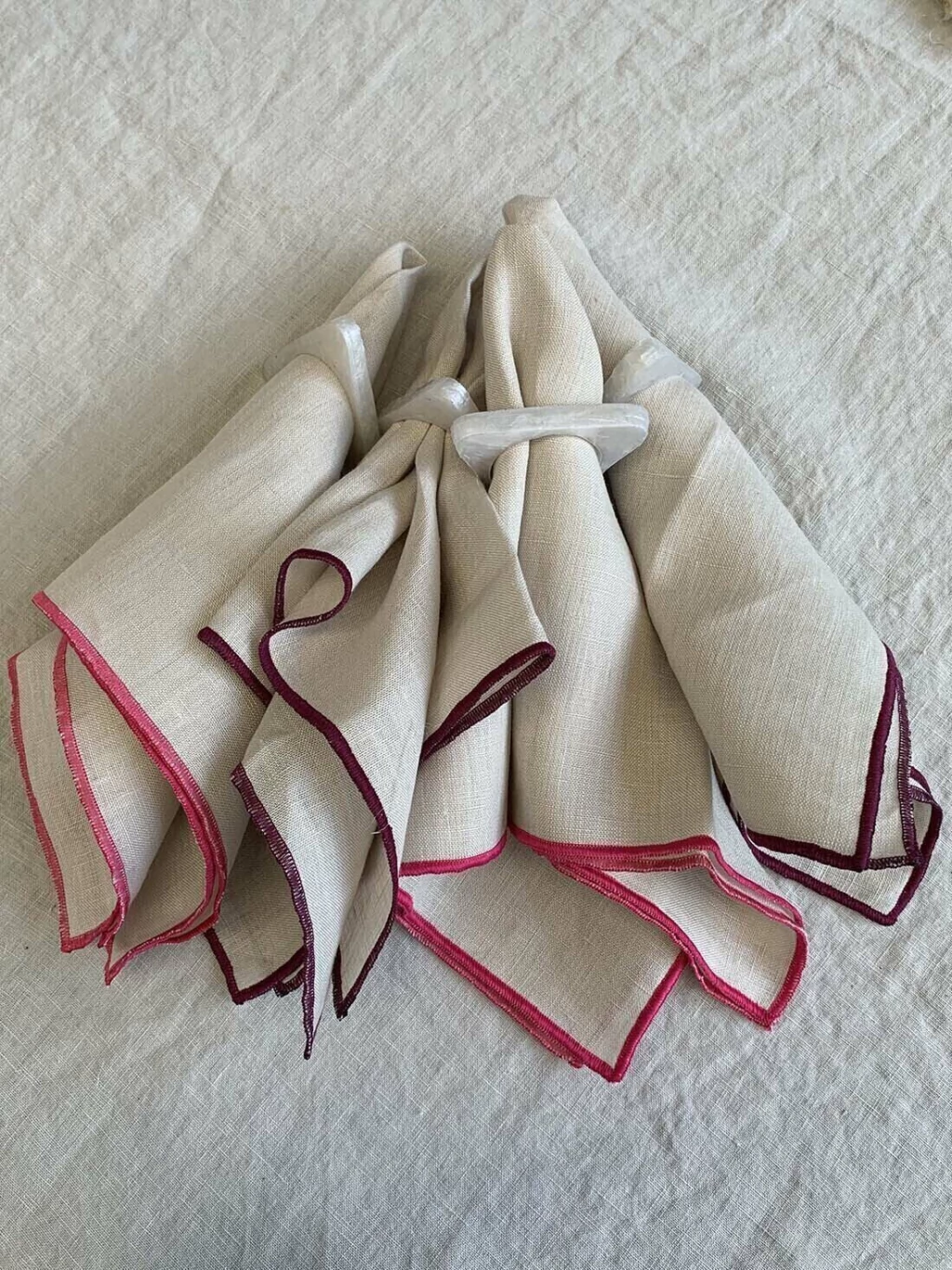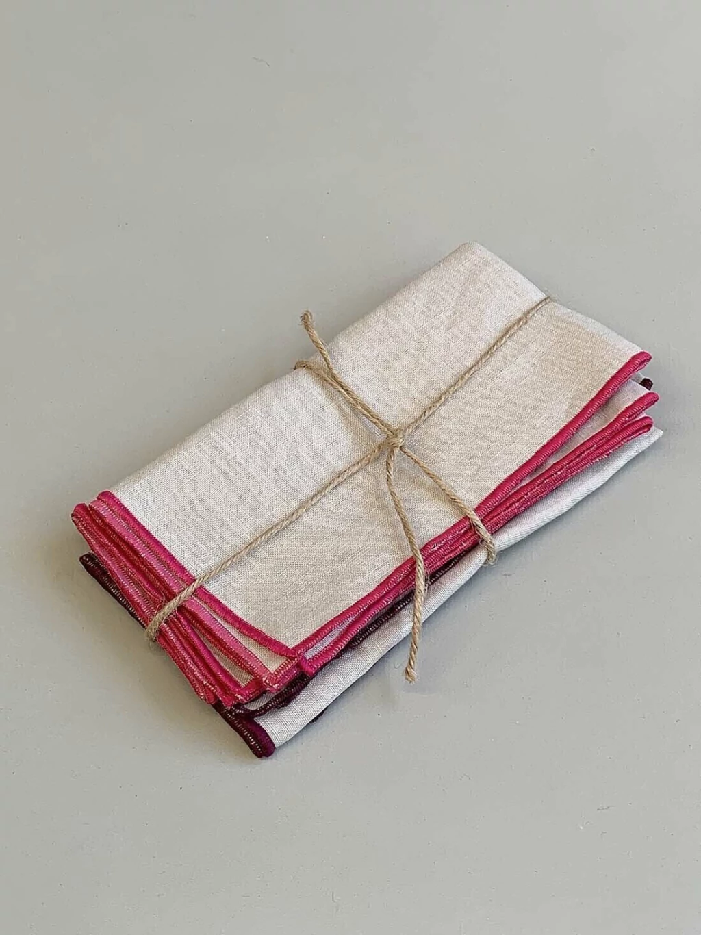 Servilletas de Lino Katmandu color beige con bordes en color fucsia y ciruela. Cada pack tiene 4 servilletas.