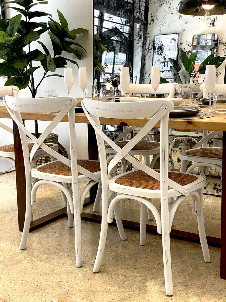 Silla de madera con efecto envejecido con asiento de esterilla.