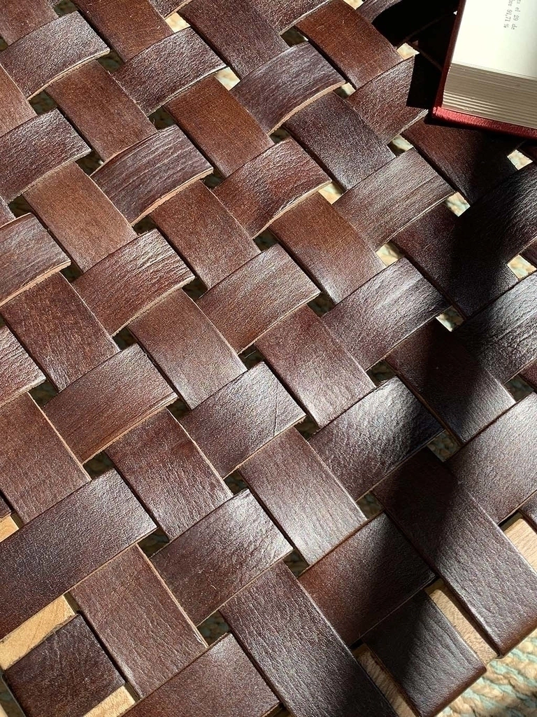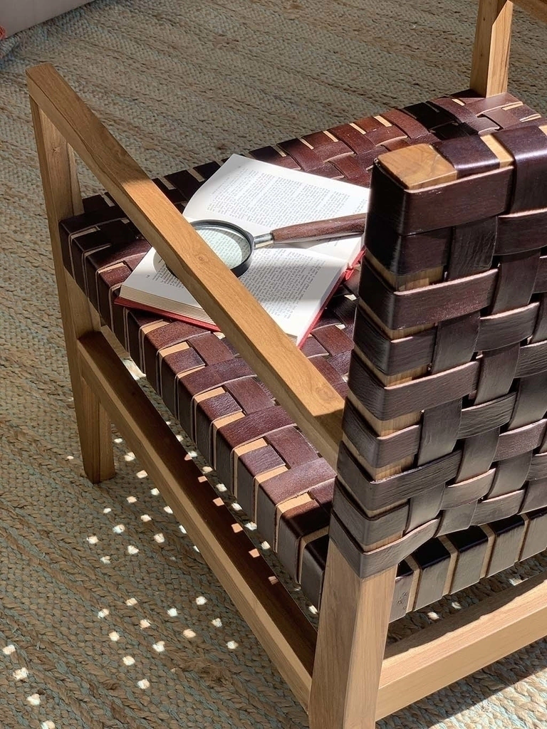 Sillón con estructura de madera petiribí y tiras de cuero trenzadas.